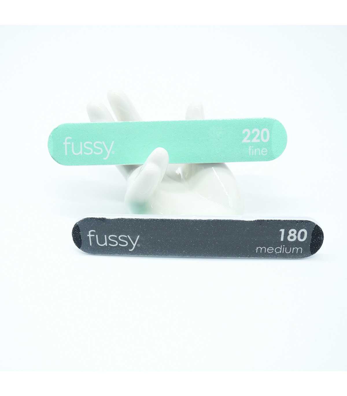 La lima de grano medio (180), de color negro, es perfecta para el limado inicial, ayudando a reducir el largo y darle una forma general a la uña.