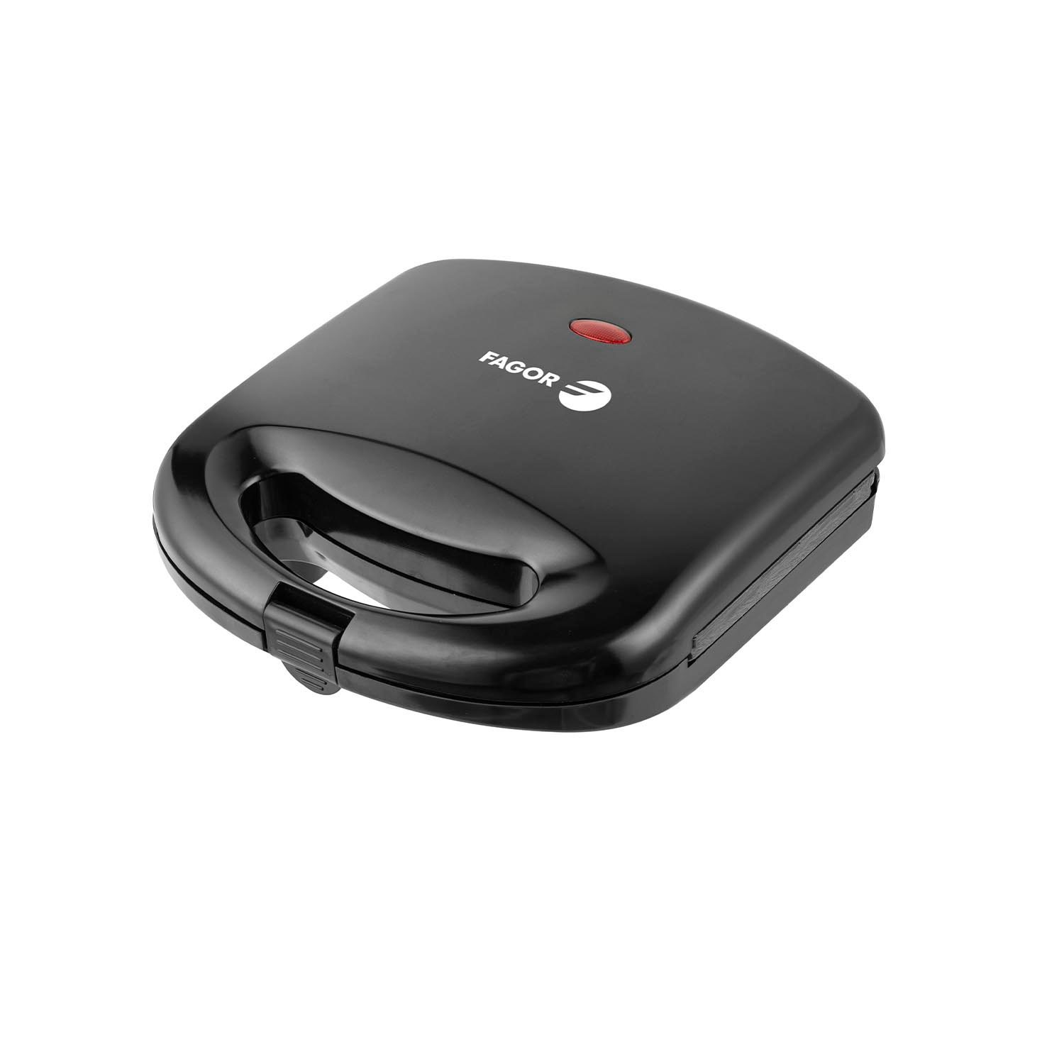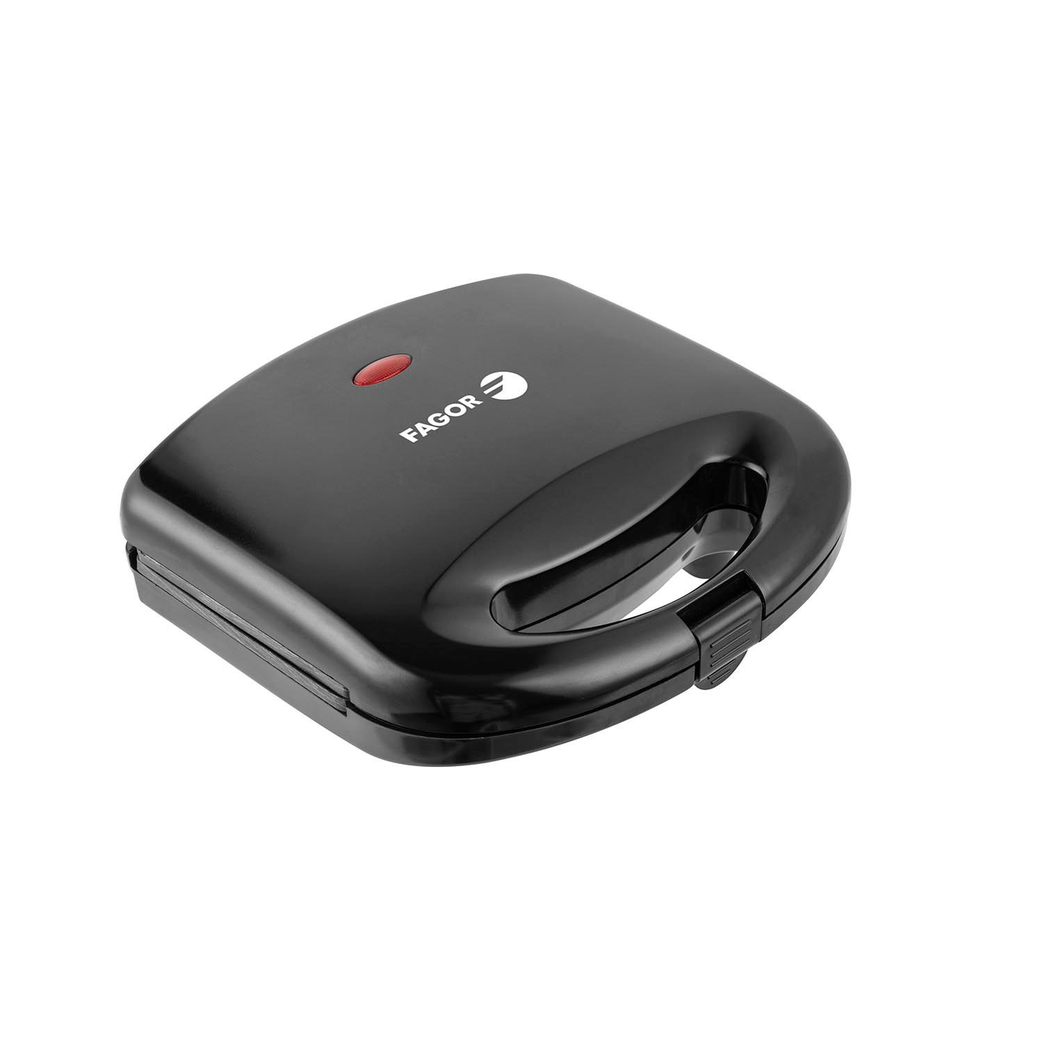 Sandwichera grill FAGOR FastCrisp de 750W, con placa continua antiadherente, control de temperatura y almacenamiento vertical. Compacta, segura y práctica.