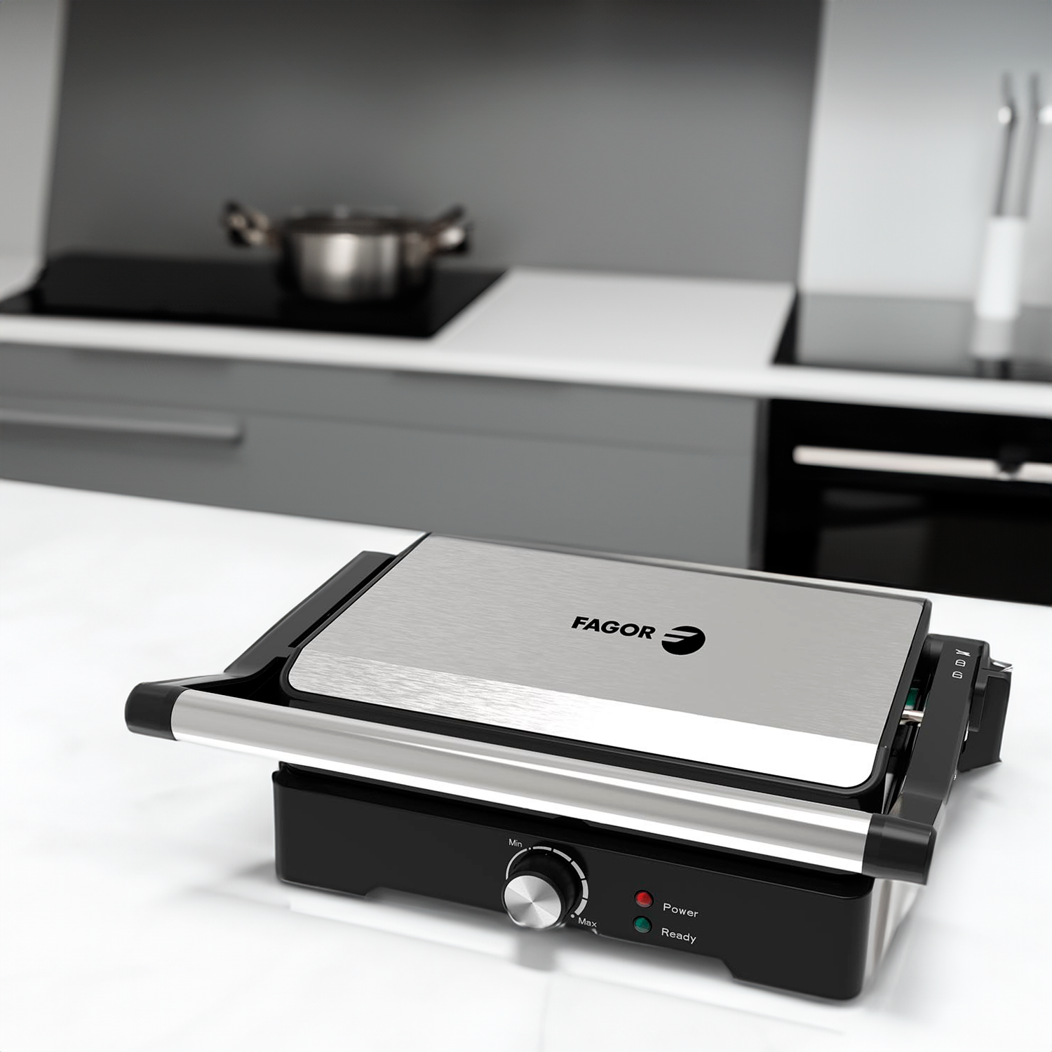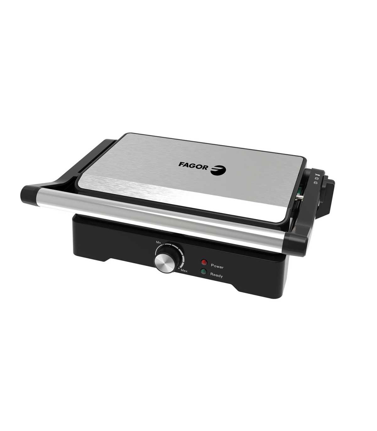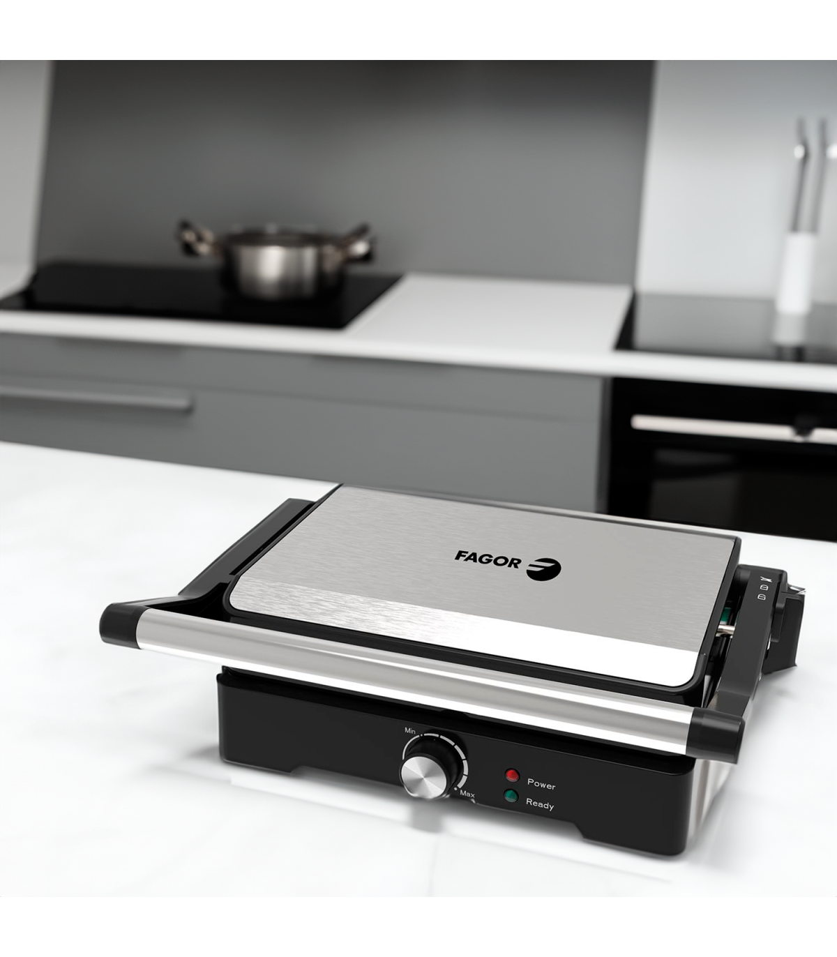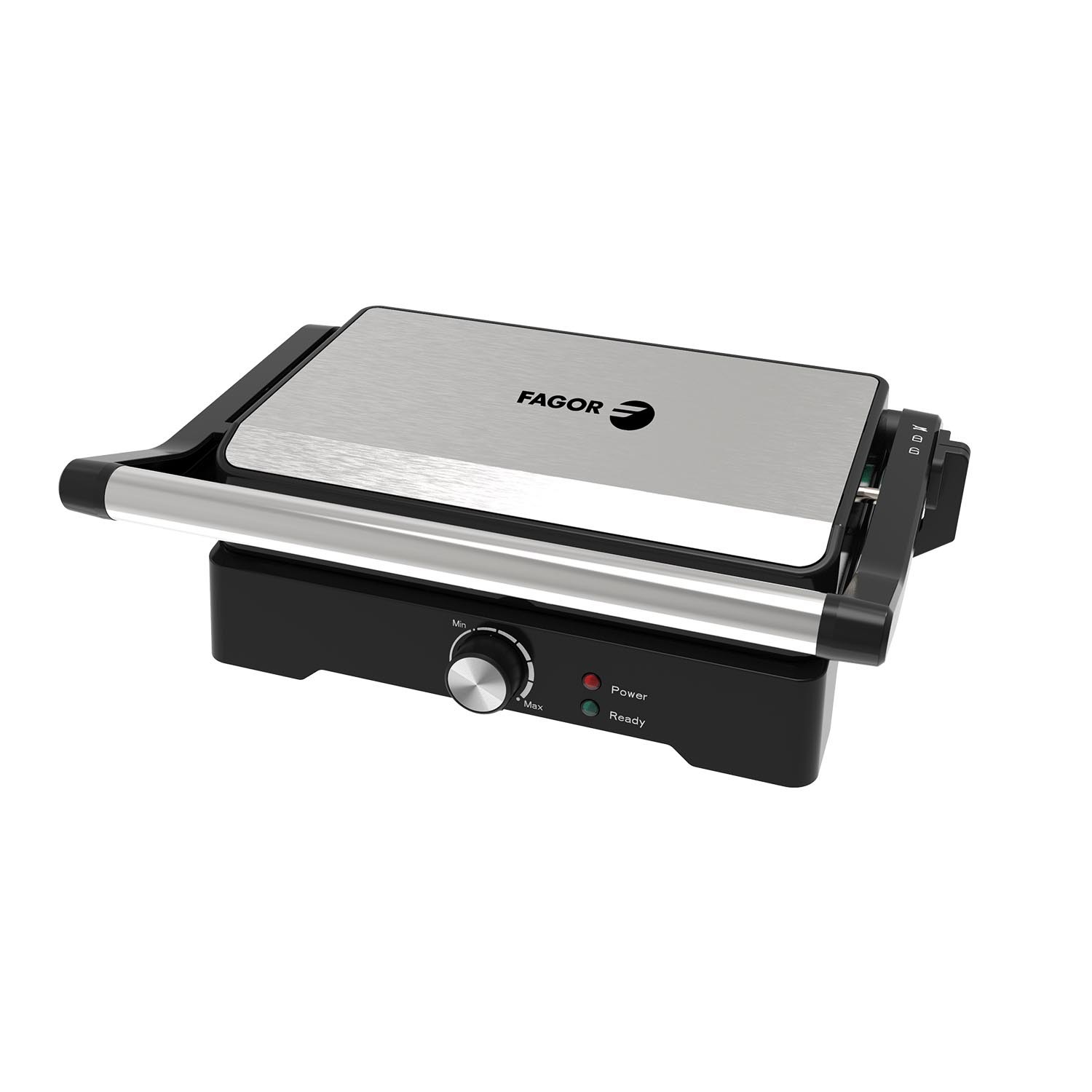 Grill multifunción FAGOR Roast Grill 1200W con apertura 180°, superficie XL antiadherente y diseño profesional para cocinar carnes, verduras y paninis con resultados perfectos.