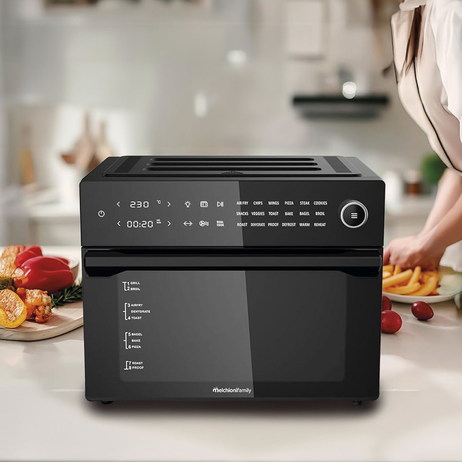 Freidora y horno 2 en 1 con 18 programas automáticos, pantalla táctil moderna y capacidad XXL de 30L para cocinar de forma saludable y versátil.