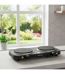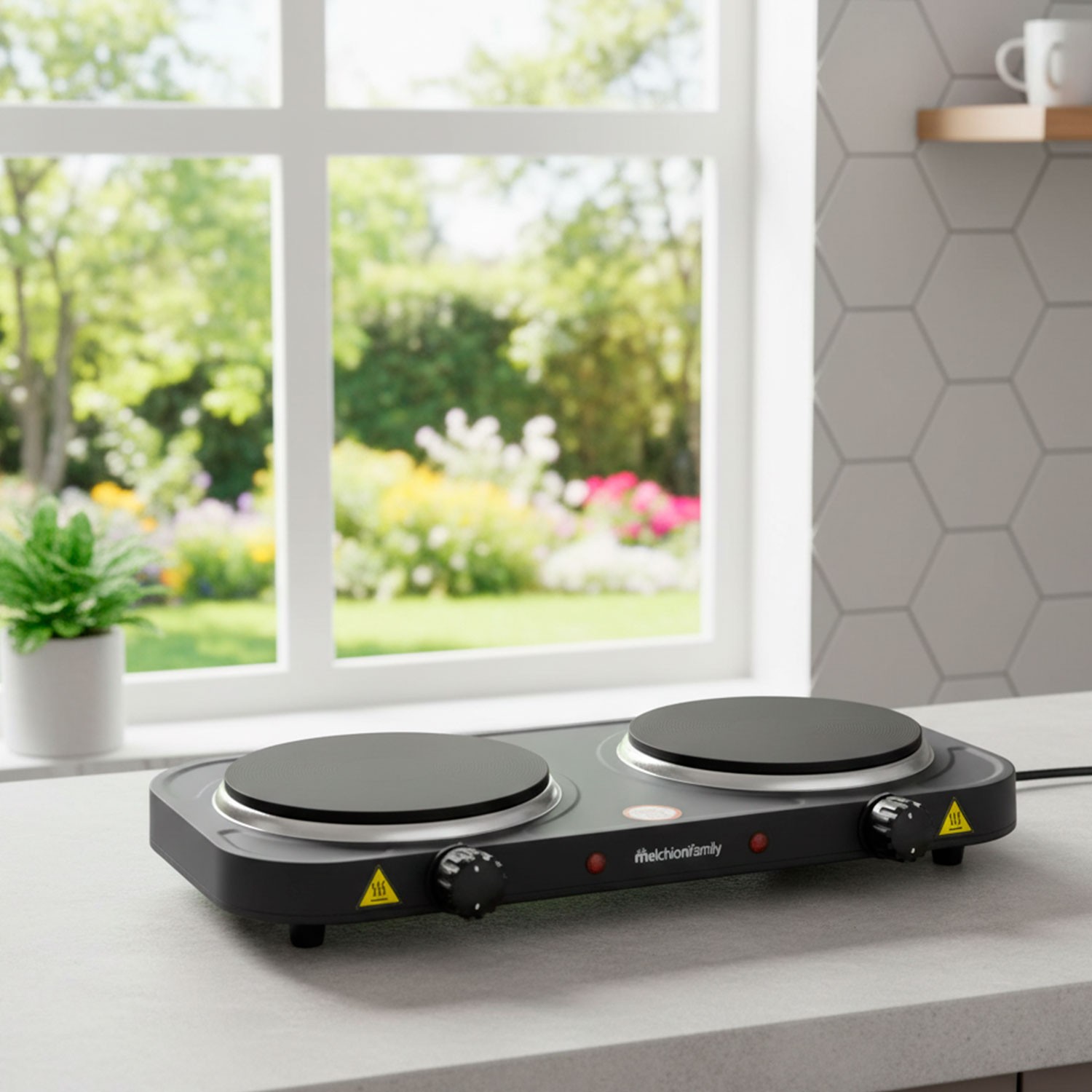 COOK 2 ofrece doble placa de fundición con control independiente, diseño compacto para cualquier espacio y potencia eficiente para cocinar en cualquier lugar.