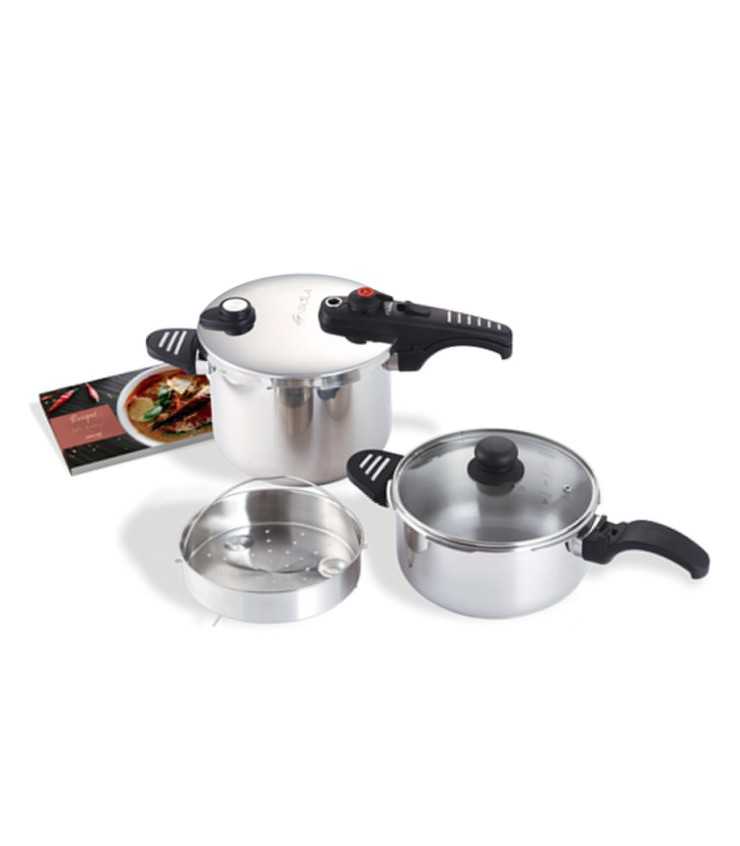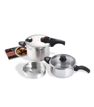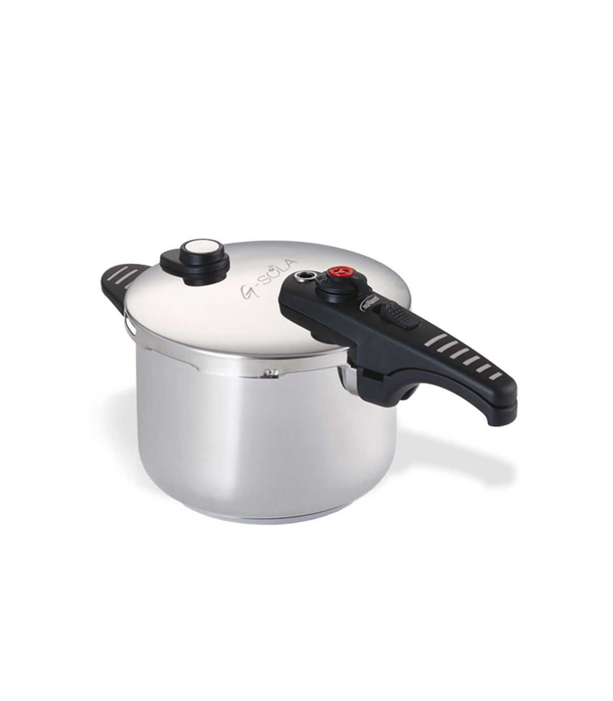 Lleva tu cocina al siguiente nivel con el set de ollas a presión G-SOLA de 4 y 6 litros, diseñado para cocinar más rápido y con total seguridad en cualquier tipo de fuego. Fabricadas en acero inoxidable 18/10 de máxima calidad, combinan durabilidad, elegancia y funcionalidad, gracias a su acabado pulido espejo exterior y marcaje interior grabado que facilita medir la capacidad de uso.