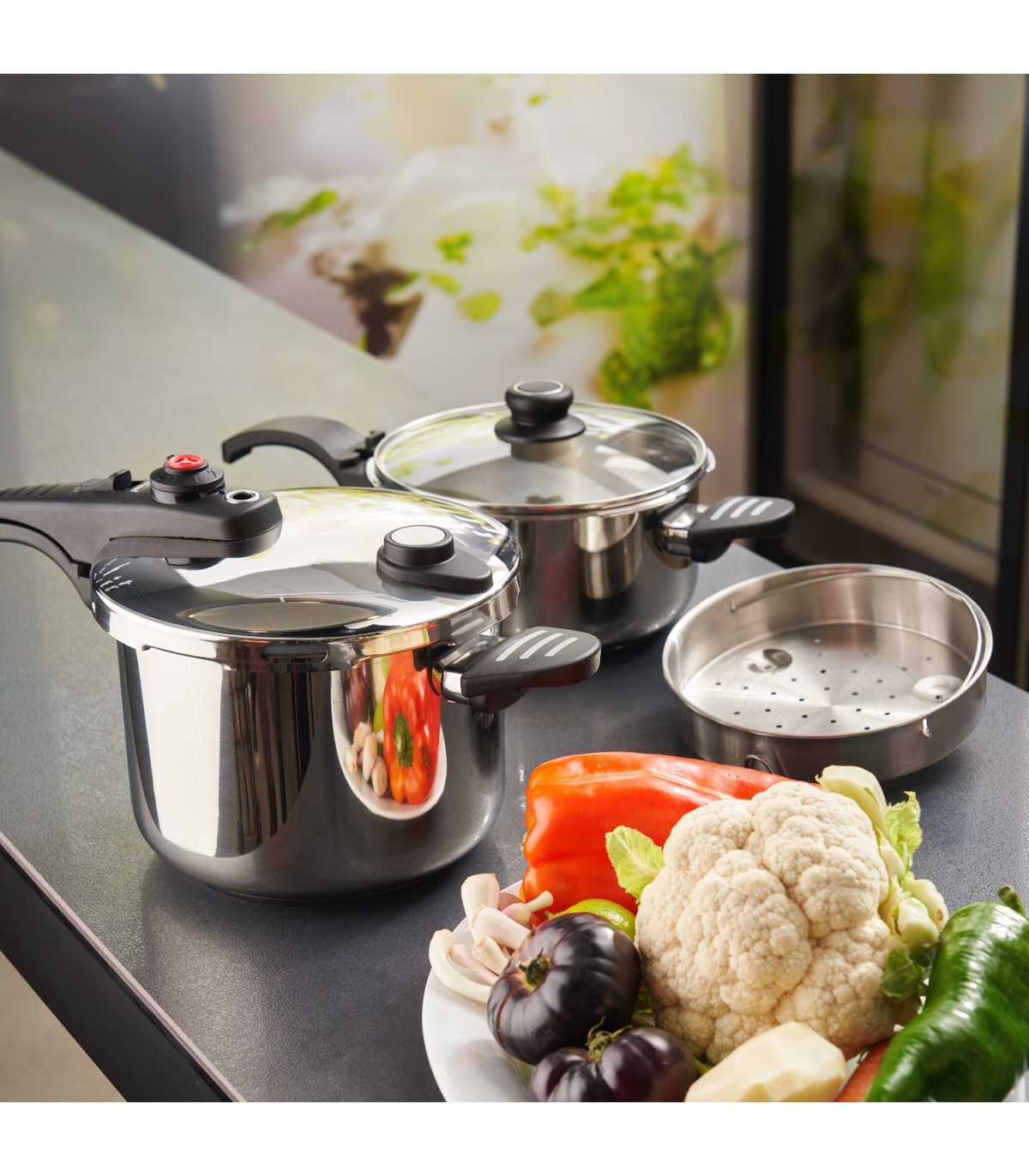 Con selector de presión y triple sistema de seguridad, estas ollas permiten varios niveles de cocción (rápida y súper rápida) y cuentan con un visualizador mediante anillas de colores, para controlar de manera precisa el tiempo y tipo de cocción. Su mango ergonómico y el cierre fácil y seguro garantizan una apertura cómoda y práctica.