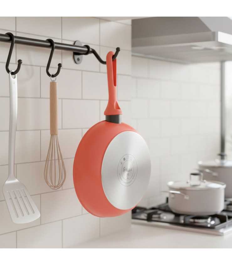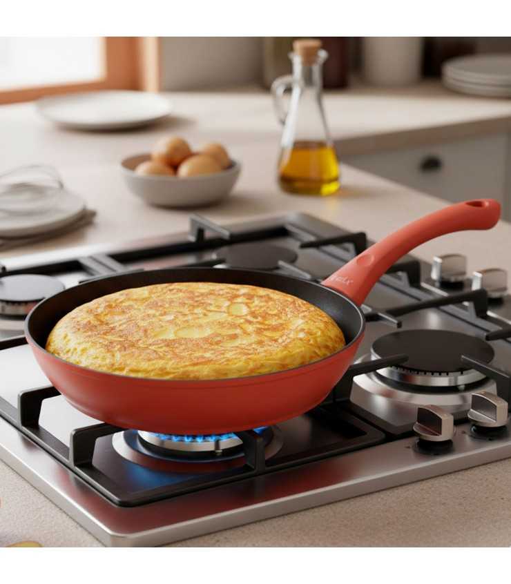 Su revestimiento antiadherente Xylna de 2 capas, libre de PFOA, permite cocinar con menos aceite y facilita la limpieza, mientras que el mango soft touch rojo garantiza un agarre cómodo y seguro. Su diseño elegante y moderno aporta color y estilo a tu cocina, combinando funcionalidad y estética.