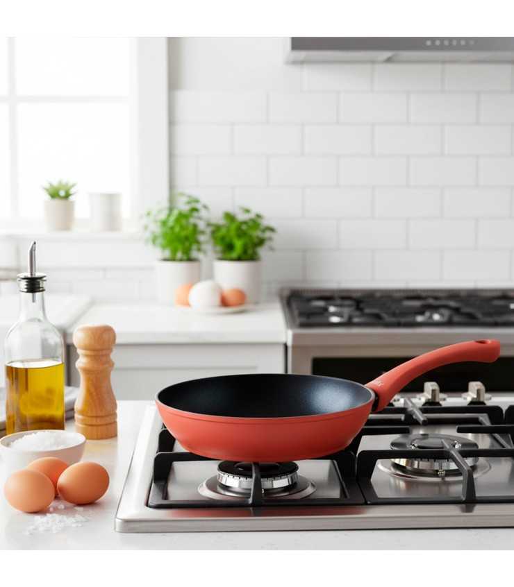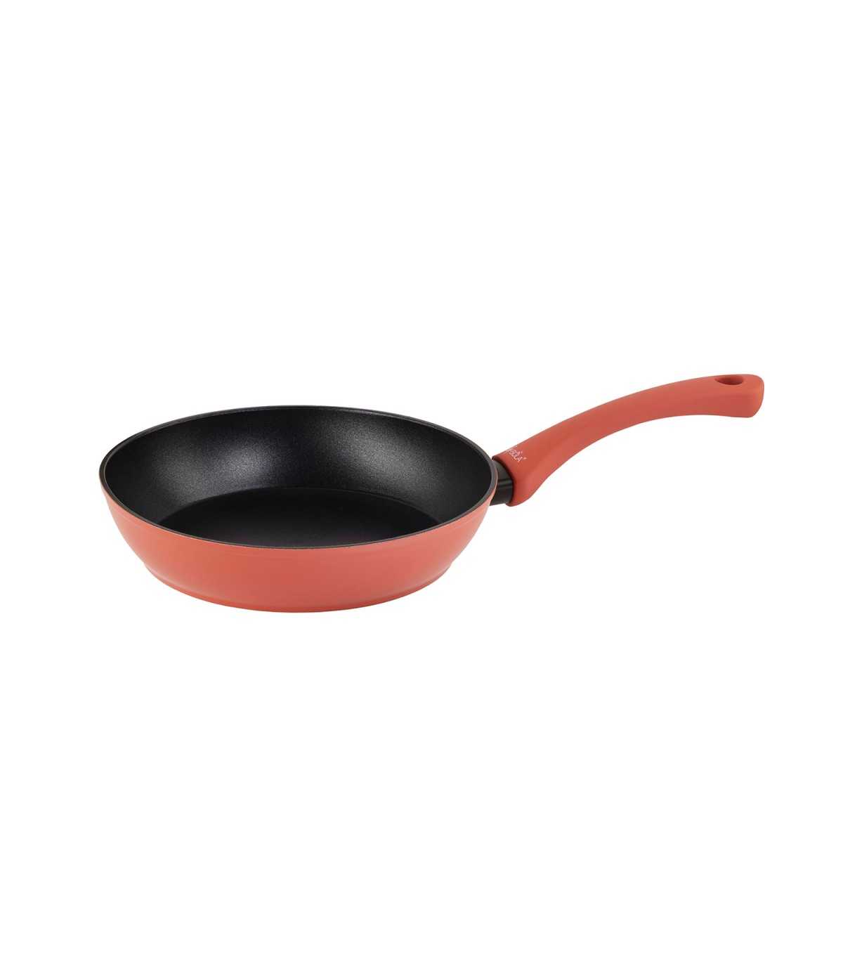 Diseño moderno y funcional: Mango soft touch rojo, ergonómico y aislante del calor; interior sin remaches y apta para lavavajillas.