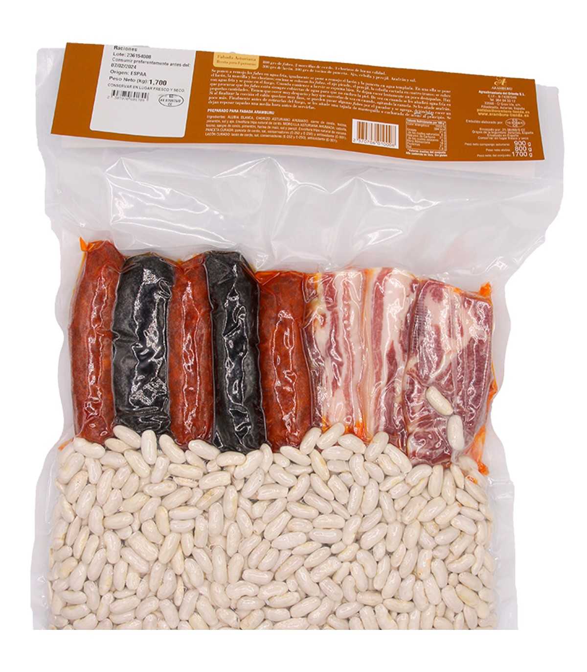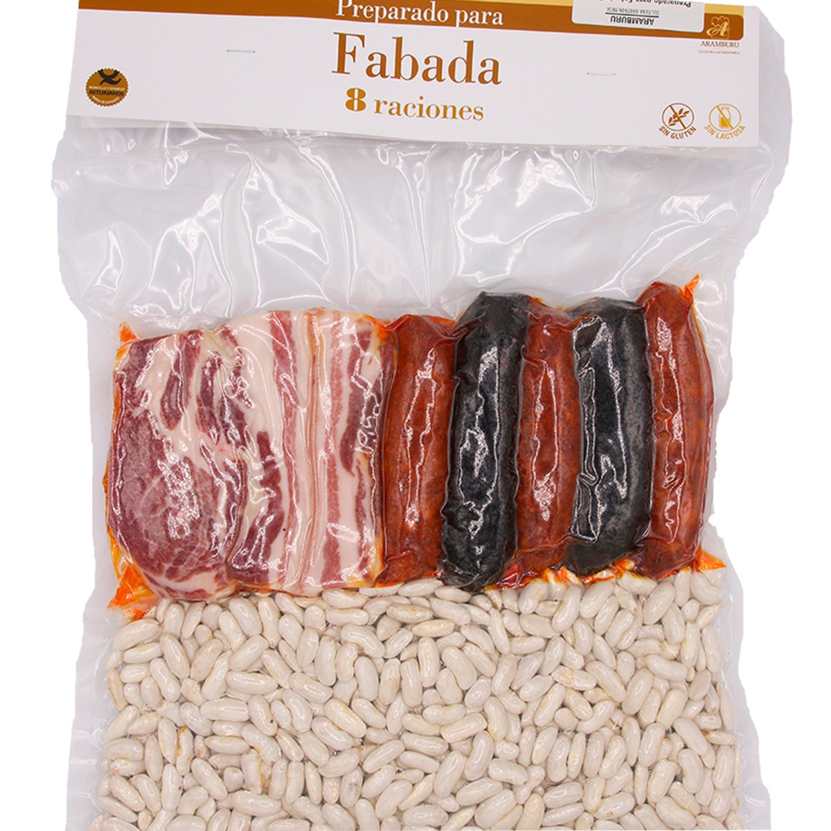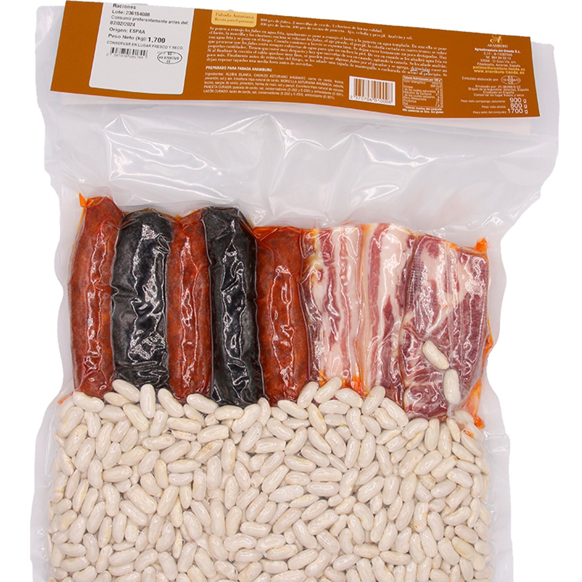 Pack de fabada de ocho raciones con compango (morcillas, chorizos, tocino y lacón) para disfrutar de una auténtica fabada asturiana en tu casa con productos de calidad Aramburu.
