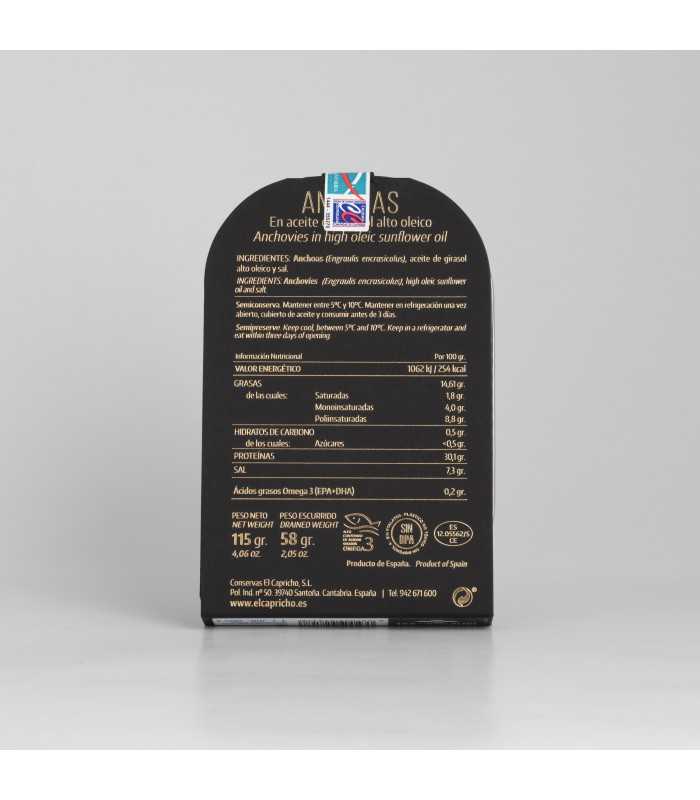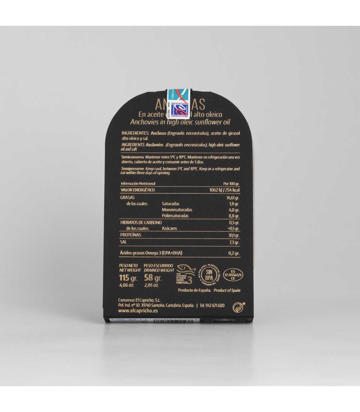 Elaborados a partir de anchoas (Engraulis encrasicolus) capturadas en las zonas FAO 27, estos filetes no contienen aditivos ni conservantes, y son aptos para personas con intolerancia al gluten o la soja.