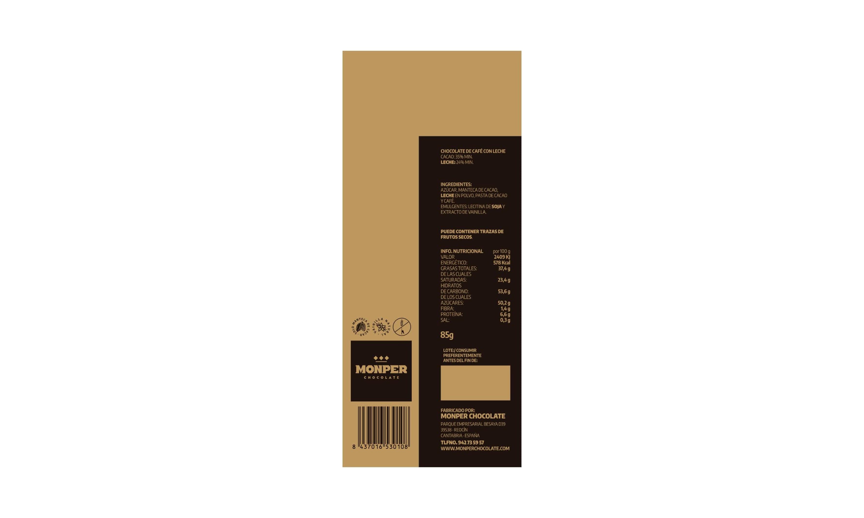 Este chocolate de café con leche de la marca Monper no tiene conservantes, colorantes ni grasas de palma. Para ser fieles al sabor original del cacao, en su elaboración tan solo usan las mejores materias primas seleccionadas con sumo cuidado.
