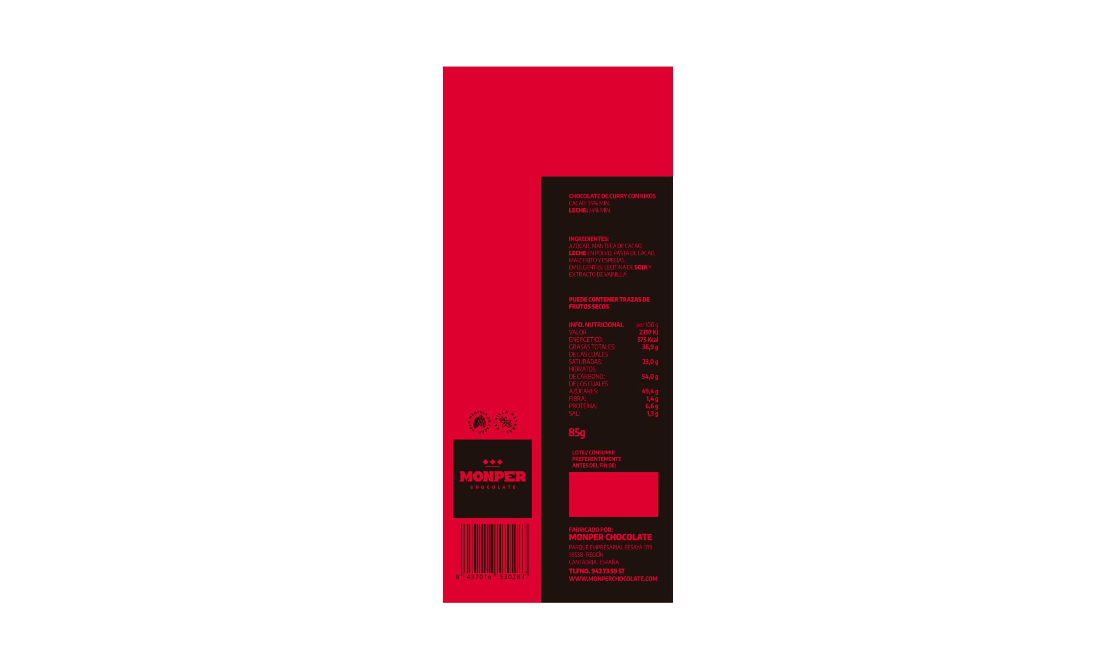 El chocolate de curry con kikos de Monper no tiene conservantes, colorantes ni grasas de palma. Para ser fieles al sabor original del cacao, en su elaboración tan solo se usan las mejores materias primas seleccionadas con sumo cuidado.