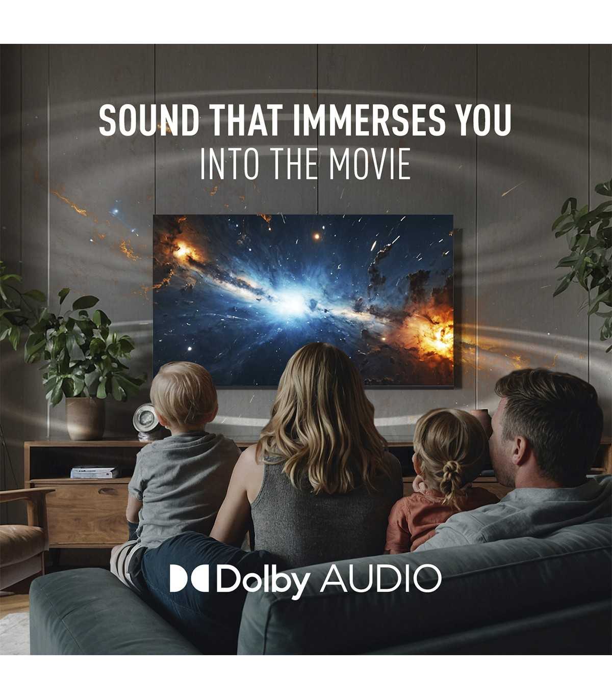 La experiencia se completa con un sonido potente de 12W (2 x 6W) con tecnología Dolby Audio, conectividad avanzada (WiFi 2T2R, Bluetooth 5.0, 3 HDMI, 2 USB, LAN RJ45, CI+) y bajo consumo energético de solo 17W en uso.